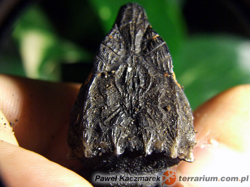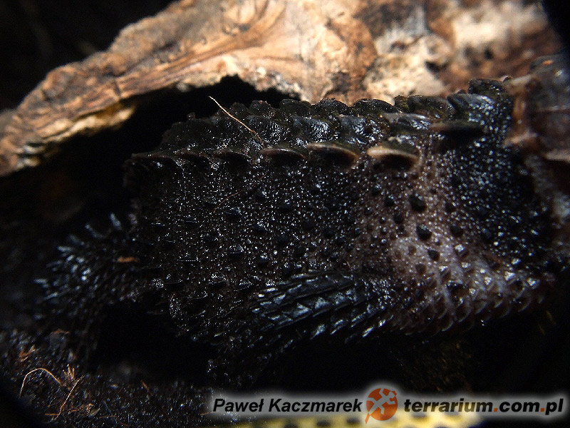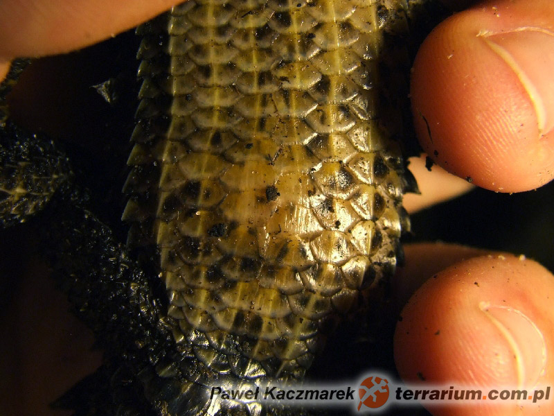 | UWAGI | W początkowej części ogona charakterystyczne jasnobrązowe pasma, z których najlepiej widoczne jest charakterystyczne V-kształtne pasmo w okolicy kloaki. Osobniki młode mają jasnobrązowe pasmo rozciągające się od karku do połowy ogona. W przeciwieństwie do dorosłych są bardziej „kolczaste” i posiadają bardziej wyrazisty V-kształtny wzór. |