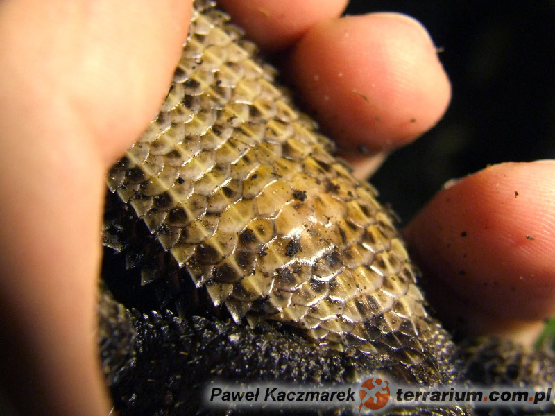 | KLUCZ | – Dwa rzędy, powiększonych łusek grzbietowych rozpoczynają się z tyłu karku, pozostawiając z przodu pole małych, wręgowanych łusek.