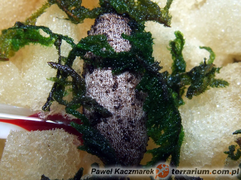 Samica w okresie ciąży wymaga specjalnego traktowania. Przede wszystkim nie wolno jej bez potrzeby wyciągać z terrarium i niepokoić w inny sposób. Bardzo ważne jest dodatkowe podawanie wapnia, prócz stosowania opisanej powyżej mieszanki. Po ok. 4-5 tygodniach po złożeniu wcześniejszego jaja, warto raz w tygodniu podawać jednego dorosłego świerszcza obficie obsypanego sepią (wapniem). Przedtem można świerszcza spryskać wodą, aby był wilgotny i sproszkowana sepia lepiej do niego przylegała. Tak przygotowanego owada należy podać samicy bezpośrednio np. z pęsety. Dodatkową „porcję” wapnia można także zaaplikować w pierwszym karmieniu po złożeniu jaja. Pozostałą część posiłku podajemy normalnie tzn. uzupełnionego w opisaną wcześniej mieszankę wapnia i witamin, bez uprzedniego zwilgocenia pokarmu. Nie wolno zapominać o oświetleniu UVB. Nie zauważyłem, aby samica bezpośrednio przed składaniem jaj, miała mniejszy apetyt, jednak w końcowym okresie ciąży należy powstrzymać się od podawania dużych ilości tłustych bezkręgowców takich jak larwy mączników, drewnojadów czy moli woskowych, by uniknąć zgubnego w skutkach przekarmienia ciężarnej samicy. Specjalne miejsce do składania jaj nie było przygotowywane. Wystarczyło stosowane w terrarium podłoże w postaci wilgotnego włókna kokosowego i niewielkiego dodatku mchu.