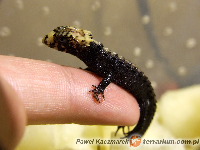 Wylegające się młode mierzą ok. 7 cm (od 6,5 cm do 8,4 cm). Przy przebiciu skorupki pomaga im, ledwo widoczny ząb jajowy. Przed wylęgiem, pojemnik, w którym bezpośrednio znajdują się jaja, należy odpowiednio zabezpieczyć, zwłaszcza jeśli jest to inkubator wodny i młody scynk mógłby się w nim utopić. Osobiście zawsze pozostawiam wyklutego scynka w inkubatorze na okres jednego dnia przed umieszczeniem go w terrarium. Młode po wylęgu bardzo często częściowo zagrzebują się w ściółce inkubatora, a przy wyciąganiu, aktywnie piszczą lub udają martwe. Zwykle nie uciekają, choć nie można tracić czujności. Młode jaszczurki są małymi kopiami rodziców, choć ich głowy nie są tak masywne jak u dorosłych. Dodatkowo różnią się znacznie ubarwieniem. Brak u nich pomarańczowo-czerwonych obwódek wokół oczu. Ich głowa jest żółta z charakterystycznie przebiegającymi czarnymi pasami. Od karku poprzez tułów do końca ogona biegnie mniej lub bardziej szeroki żółty pas. Tak jak u osobników dorosłych występują żółte obrączki na palcach. Reszta ciała jest jednolicie czarna.Z biegiem czasu pojawiają się obwódki wokół oczu, a żółta barwa głowy zostaje ograniczona do pasów (na przemian z czarnymi) na pysku, a także kolców „hełmu” z tyłu głowy. „Pozostałości” charakterystycznego żółtego ubarwienia w prosty sposób pomogą nam odróżnić podrostki od osobników starszych.Młode zaczynam karmić po 3-4 dniach od wylęgu. Początkowo scynki nie chciały jeść świerszczy (podstawy diety), dlatego zwykle po nieudanych próbach karmienia (mimo wszystko zawsze warto spróbować), przez okres jednego tygodnia podawane są 4-5 mm larwy moli woskowych, za którymi przepada większość jaszczurek. Po tym czasie, mole woskowe podawane są na zmianę ze 3mm świerszczami (tj. jednego dnia świerszcze, drugiego mole). Po tygodniu stosuję 1- dniową głodówkę, po której podawane są świerszcze, a mole przez pewien czas są odstawiane. Ważne, aby świerszcze nie były zbyt duże i tak jak już pisałem nie były raczej większe niż 3 mm. Pokarm wrzucany jest zawsze do kryjówki, w której znajduje się scynk. Ważne by jaszczurka nie stresowała się obecnością hodowcy, dlatego to rozwiązanie jest najlepsze. Nie jest jednak pozbawione wad, dlatego, że utrudnia obserwację scynka. Rozwiązaniem może być nasłuchiwanie odgłosów dobiegających z kryjówki (mówiących nam o upolowaniu zdobyczy), odkrywanie po pewnym czasie kryjówki i kontrola zjedzonych owadów, czy zakup kamery inspekcyjnej. Nie zapominajmy także o kontroli ilości odchodów w terrarium. Wyraźny wzrost zainteresowania świerszczami, obserwowałem po ok. miesiącu. Jeśli podstawa diety (świerszcze) przyjmowana jest bez większych problemów, dietę młodego scynka możemy urozmaicić poza molami woskowymi, także o: małe, lądowe ślimakami skorupowe (ślimak zaroślowy, wstężyk gajowy), dżdżownice, a także koniki polne i pasikonikami, które jako, że są to owady prostoskrzydłe (Orthoptera) mogą stanowić również podstawę diety.Młode scynki karmimy codziennie (podstawa diety – „do oporu”, uzupełnienie – w rozsądnych ilościach) i każdorazowo pokarm uzupełniamy w wapń (np. startą sepię), prócz jednego dnia w tygodniu, kiedy podawane są witaminy (np. Reptimineral). W miarę wzrostu jaszczurki, do karmienia możemy wybierać coraz to większe bezkręgowce. Okresowe 1-dniowe głodówki, są jak najbardziej wskazane. Dieta młodych scynków wygląda więc inaczej niż dorosłych osobników.