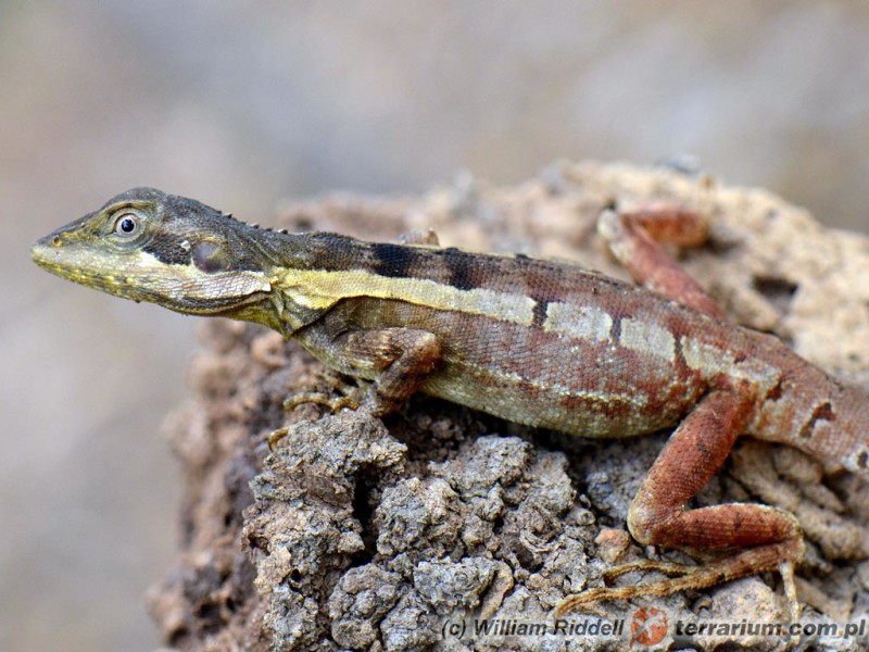 Terrarium tropikalne. Jako, że jest to gatunek prowadzący przynajmniej częściowo nadrzewny tryb życia terrarium powinno być stosunkowo wysokie, tak aby pomieściło kilka grubych, ustawionych pionowo konarów do wspinaczki. W centrum terrarium należy umieścić oddalony nieco od innych konar, który będzie stanowił grzędę obserwacyjną dla dominującego osobnika. Za podłoże najlepiej użyć mieszaniny torfu kokosowego i ziemi lub darni. W terrarium można ułożyć odporne rośliny tropikalne, które będą urozmaicać otoczeni gadom a także będą wspomagać utrzymywanie odpowiedniego mikroklimatu. Nie należy również zapomnieć o kryjówkach – najlepiej sprawdzają się duże, wydrążone pnie dębu korkowego. Jaszczurki te w naturze stosunkowo dużo piją,dlatego trzeba zapewnić im odpowiedni zbiornik ze świeżą wodą.