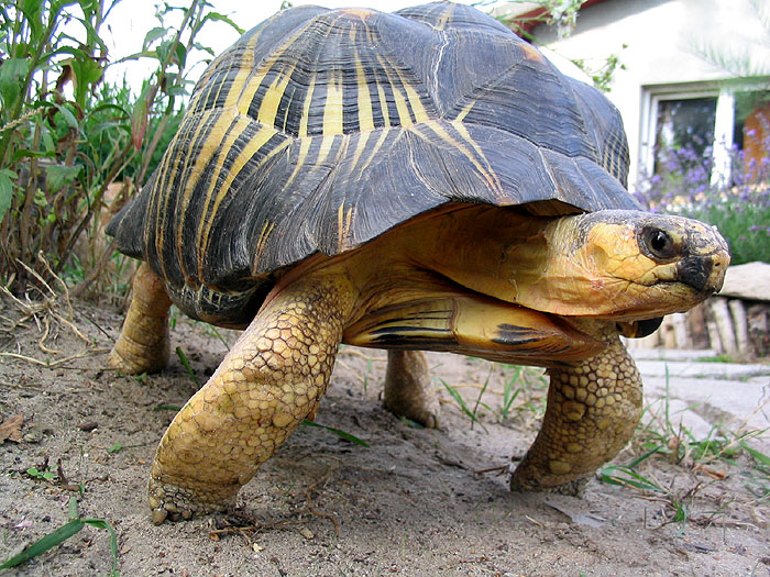 Trochę to zastanawia, ponieważ z uwagi na swoją atrakcyjność żółwie te powinny być nieco lepiej poznane. Obecnie posiadam tylko jednego żółwia promienistego, który jest pod moją opieką już od 20 lat. Na początku mierzył zaledwie 9 cm wtedy i otrzymał imię Genezyp – w skrócie Zypcio. Teraz Zypcio waży ponad 7 kilogramów, a jego karapaks mierzy przeszło 33 cm. Wspominam o imieniu, ponieważ żółw na nie reaguje – brzmi to mało prawdopodobnie i jeszcze mniej poważnie, ale spróbuję wyjaśnić to w sposób, który może to uwiarygodnić. Tymczasem czytajmy „imię” jako „sygnał dźwiękowy”. Jestem świadom tego, że żółw nie postrzega „swojego imienia” jako swojego imienia. Ale jestem jednocześnie pewien, że słyszy dźwięki, a ten jeden – czyli nadane mu przeze mnie imię – wyróżnia z pozostałego, wydawanego przeze mnie „słowotoku” – albo też wyławia z ciszy, kiedy wyłącznie nawołuję go jego imieniem.