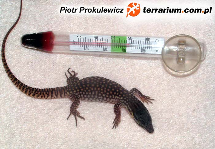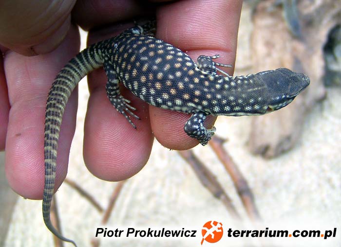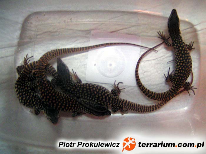 Wyklute warany trzymamy w podobnych warunkach jak dorosłe z nieco niższą temperaturą i wyższą wilgotnością (podłoże delikatnie zwilżamy kilkakrotnie w ciągu dnia), w ten sposób redukujemy do minimum ryzyko odwodnienia organizmu na które tak młode osobniki są niezmiernie wrażliwe. Pierwsze dni mogą spędzić na papierowych ręcznikach, a następnie na naturalnym podłożu np. na piasku. Karmimy codziennie owadami oraz innymi bezkręgowcami odpowiedniej wielkości, z dodatkiem witamin oraz makro- i mikroelementów – to jest jeden z niewielu przypadków gdzie stosuję regularnie pełną suplementację. Moje urocze maluchy rozpoczęły pobieranie pokarmu po 5-6 dniach. Choć wybór owadów karmowych miały naprawdę ogromny to zdecydowały się niestety na mączniki. Następnie zakosztowały pająków(z tego co zauważyłem są ulubionym pokarmem wszystkich moich maluchów)znalezionych w ogrodzie i dopiero po kolejnych 3 czy 4 karmieniach zaczęły polować na wszystko co się rusza – świerszcze, karaczany, ćmy.