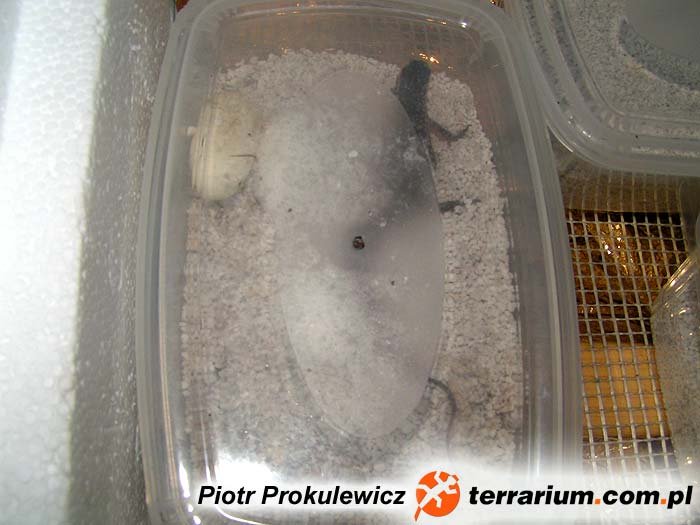 Gdy walczyłem z przypadłością samczyka polegającą na odmowie przyjmowania jakiegokolwiek pokarmu (przerwy w jedzeniu po 18-21 dni, a stan ten trwał przez kilka miesięcy) wpadłem na pomysł zimowania z drastycznym obniżeniem temperatury, krótkim dniem 6-7 h, bez UVB. Warunki takie utrzymywałem zaledwie 15 dni- nie miałem już sumienia dręczyć ich dłużej – i stał się „cud”, samczyk odzyskał apetyt i nabrał takiego wigoru, że bardzo szybko doszło do wielokrotnych kopulacji z bardzo agresywnymi zachowaniami z jego strony. Miesiąc później zostało złożonych 6 jaj.
