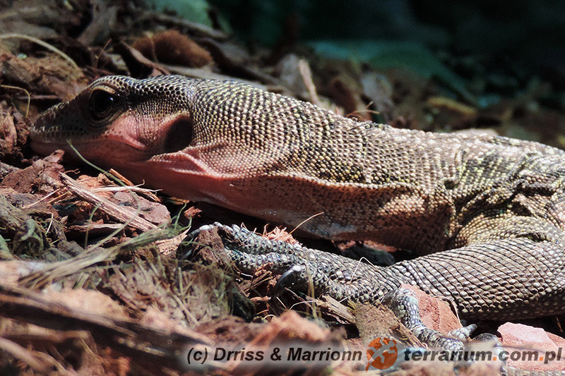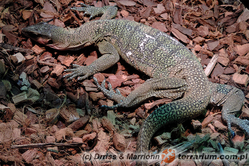 Na podłoże możemy wykorzystać nawet kilkudziesięciocentymetrową warstwę mieszanki piasku, ziemi i substratu cyprysowego. Taka mieszanka będzie doskonale podtrzymywać odpowiednio wysoki poziom wilgotności. Nieodzownymi elementami wystroju będą liczne konary, gałęzie, oraz wydrążone kawałki pni lub tuby z dębu korkowego umożliwiające tym waranom ukrycie się. Duży basen pozwalający waranom na korzystanie z kąpieli. Wymagane jest regularne, codzienne i silne opryskiwanie wewnątrz zbiornika (raz dziennie przez kilka minut).