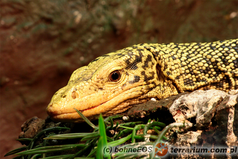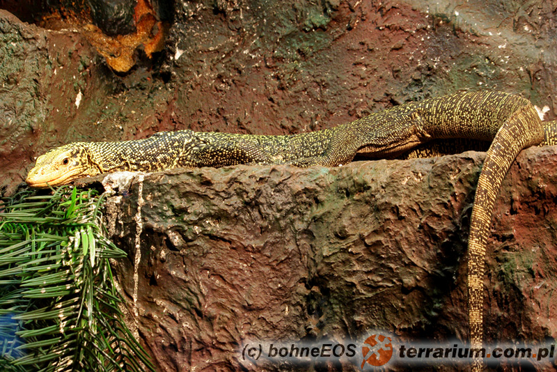 Terrarium tropikalne. Dla pary waranów należy zapewnić przestronne terrarium z dużą częścią wodną, która umożliwi im pływanie i nurkowanie (z temp. wody min. 27°C ). Ścianki boczne i tylna powinny być wyłożone np. płytami z korka, liczne konary z dodatkiem naturalnej lub sztucznej roślinności oraz kryjówki z tub korkowych zapewniające waranom intymność i możliwość schronienia się; z grubą warstwą podłoża np. kory sosnowej.
