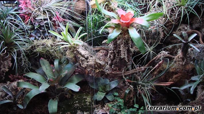 – rośliny lądowe. Tutaj należy uważać albowiem zależnie od techniki użytej do budowy terrarium użyjemy innych roślin. Jeśli zbiornik wodny jest oddzielony od części lądowej i woda nie przesiąka możemy wtedy posadzić niemal dowolny gatunek rośliny, pod warunkiem, że nie posiada ostrych brzegów liści lub kolców. Jeśli natomiast ląd stanowi np. wysypany tylko żwirek (nie ma ścianki odgradzającej wodę) to najlepiej posadzić gatunki bagienne, lubiące gdy korzenie są stale zanurzone w wodzie. Np. tatarak, skrzydłokwiat, scindapsus, epipremnum.