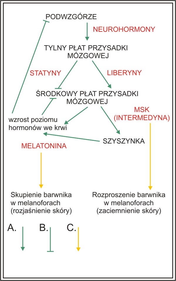 C – wpływ hormonów na ziarna pigmentu w melanoforach.