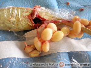 Zaleganie jaj → Przypadłość ta jest jedną z najbardziej powszechnych u gadów. Jest wiele przyczyn powstania takiej sytuacji, jednak nie jest zbadane dlaczego dokładnie takie przypadki mają miejsce. Z dotychczasowych badań wynika, że zaleganie jaja może wystąpić u samic, które po raz pierwszy przeprowadzają lęgi, u samic, które wcześniej miały przypadki zatrzymania jaj i u samic ciężarnych z jajami niezapłodnionymi. Zaleganie jaj może być również spowodowane warunkami, w których zwierzę jest utrzymywane. Jednak jednym z głównych powodów jest niemożność przedostania się jaj przez jajowód i kloakę, co się pojawia gdy jaja są zbyt duże, gdy są nieprawidłowo ułożone, gdy skorupka jest ukształtowana nieprawidłowo, lub gdy jaja w jakiś sposób są ze sobą złączone. Nawet jedno niekształtne lub zbyt duże jajo może spowodować zaczopowanie.