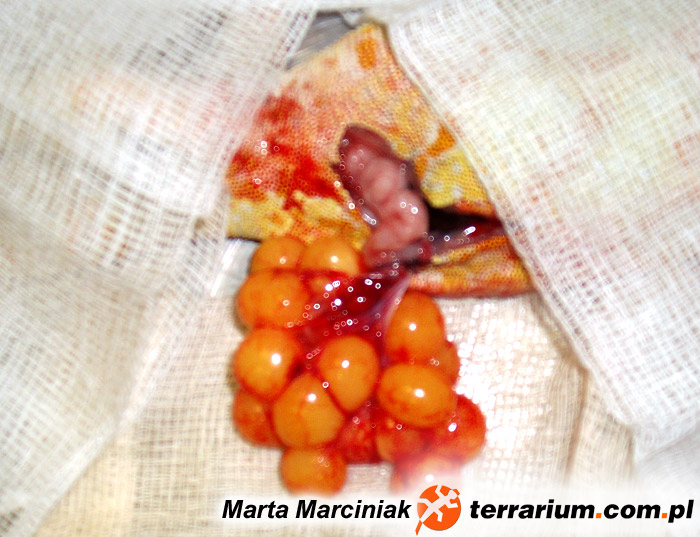 Po operacji samica pozostaje przynajmniej trzy doby pod opieką lekarską, a następujący bezpośrednio po niej okres rekonwalescencji może być przeprowadzony w warunkach domowych. Ze względu na obecność szwu pooperacyjnego zalecam umieszczenie jaszczurki na podłożu z ręczników papierowych. Z terrarium należy usunąć wszelkie przeszkody typu skałki, konary, z których osłabiona samica mogłaby spaść. Niezbędne jest odseparowanie samicy od innych osobników, jeżeli utrzymywanych jest kilka sztuk. Bezwzględnie należy zapewnić dobre warunki utrzymania, czyli odpowiednią temperaturę, wilgotność i ekspozycje na promienie UVB w przypadku agam i kameleonów. Basen z wodą należy zabrać, by samica nie zamoczyła szwu, a jako źródło wody stosować zraszanie terrarium i płytką miskę z wodą. Pożywienie musi być urozmaicone i wzbogacone w wapń, najlepiej podawane codziennie, aby uzupełnić ubytki związane z ciążą. Witaminy należy podawać raz w tygodniu.