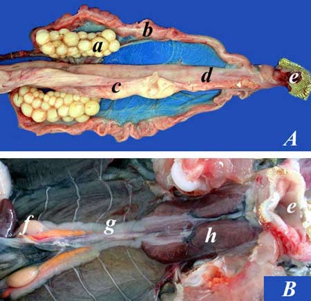 Ryc. 8. Układ moczowo-płciowy, A samica, B samiec: a – jajnik, b – jajowód, c – pęcherz moczowy, d – jelito proste, e – kloaka, f – jądro, g – nasieniowód, h – nerka