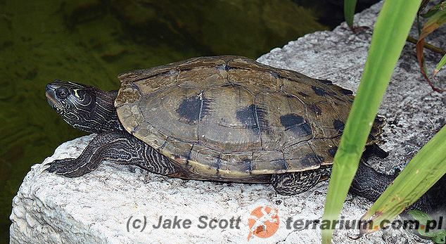 Część wodna zbiornika lub stawu musi być dostatecznie głęboka, by żółwie mogły się całkowicie zanurzyć i swobodnie popływać. Część lądowa jest także wymagana, zwykle najwygodniej ulokować ją przy jednym z końców zbiornika. Trzeba zapewnić łatwy dostęp do części lądowej, najczęściej stosuje się pochyłe rampy. Strzeż się jednak wyposażenia, pod którym żółw może zostać uwięziony. Część lądowa może składać się z zanurzonych cegieł podpierających wierzchnią warstwę z torfu i żwiru. Jest to szczególnie ważne dla samic, które potrzebują odpowiedniego miejsca do składania jaj. W takich przypadkach upewnij się, że wierzchnia warstwa ma głębokość równą co najmniej długości karapaksu żółwia. Aby wierzchnia warstwa części lądowej nie nasiąkała wodą, można ją umieścić w plastikowej podstawie. Umieszczona nad lądem lampa do wygrzewania powinna zostać tak umieszczona, by zapewnić sztuczną możliwość wygrzewania.