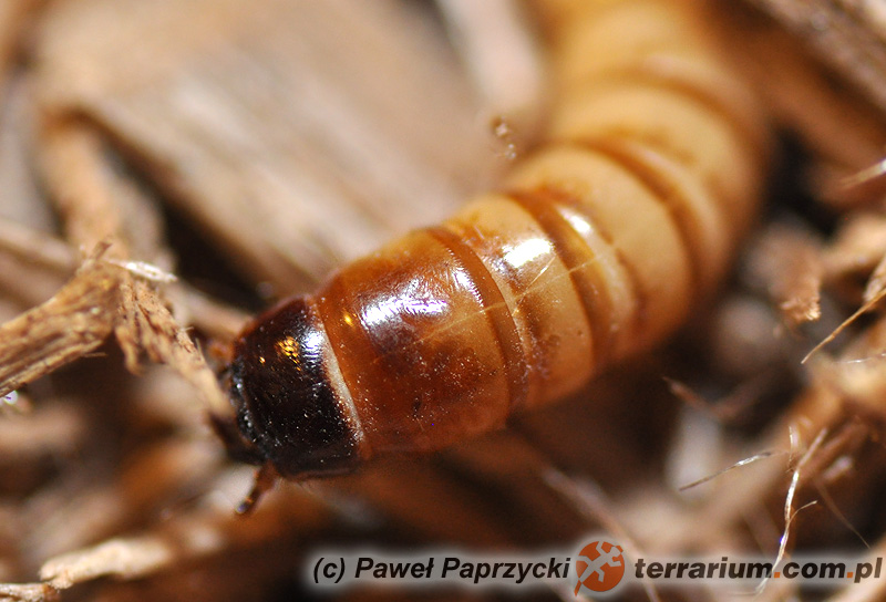 Larwy jasnokremowe do żółtawych, brązowe w okolicach puszki głowowej i na granicy segmentów. Posiadają krótkie 3 pary odnóży i niemal niewidoczne czułkui. W ostatnim stadium osiągają ponad 50 mm.