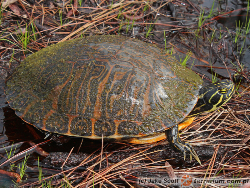 Żółwie ozdobne wolą pokarm zwierzęcy, który zawsze podajemy rozdrobniony. Proporcje podawanej karmy ustalamy tak, aby dorosły osobnik dostawał po mniej więcej 50% karmy mięsnej i 50% karmy roślinnej w każdorazowej dawce, zaś dla osobnika młodego proporcja ta wynosi 70% do 30%. Witaminy i wapń podajemy po jednej kropli, dwa razy w tygodniu, zaś związki mineralne po 100 mg dla dorosłego osobnika i stosujemy je nie częściej niż dwa razy w tygodniu. Powszechnie dostępne w sklepach zoologicznych są również gotowe witaminizowane i mineralizowane karmy dla żółwi wodnych. Dieta roślinna winna odznaczać się dużym urozmaiceniem. Zaleca się rozdrobnienie i wymieszanie różnych warzyw i owoców razem, co pozwala żółwiowi wybrać z przygotowanej sałatki smaczniejsze kąski. Przy okazji mamy możliwość zorientowania się co wybierze nasz ulubieniec. Wszystkie produkty powinny być surowe i starannie umyte. Owoce miękkie podajemy po wypestkowaniu, warzywa kroimy w kostkę, zaś produkty twarde, należy zetrzeć na tarce. Podawana karma musi być każdorazowo świeżo przygotowana